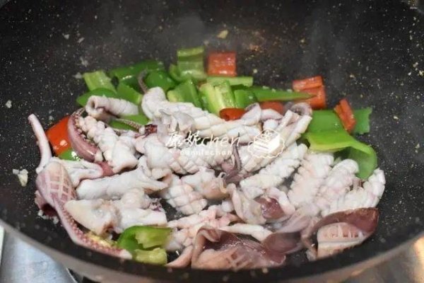 把青红椒炒得断生,放入鱿鱼,用大火爆炒。