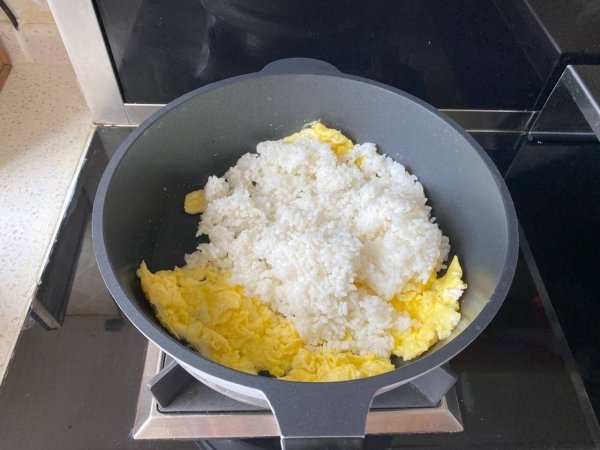 4、 然后我们再吃上米饭也加进去,将鸡蛋和米饭翻炒在一起,鸡蛋块儿炒碎要跟米粒差不多大。