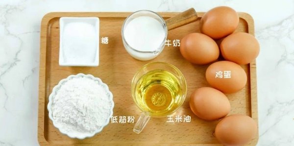 低筋粉90克 / 玉米油75克/牛奶75克 / 糖35克 / 鸡蛋6个
